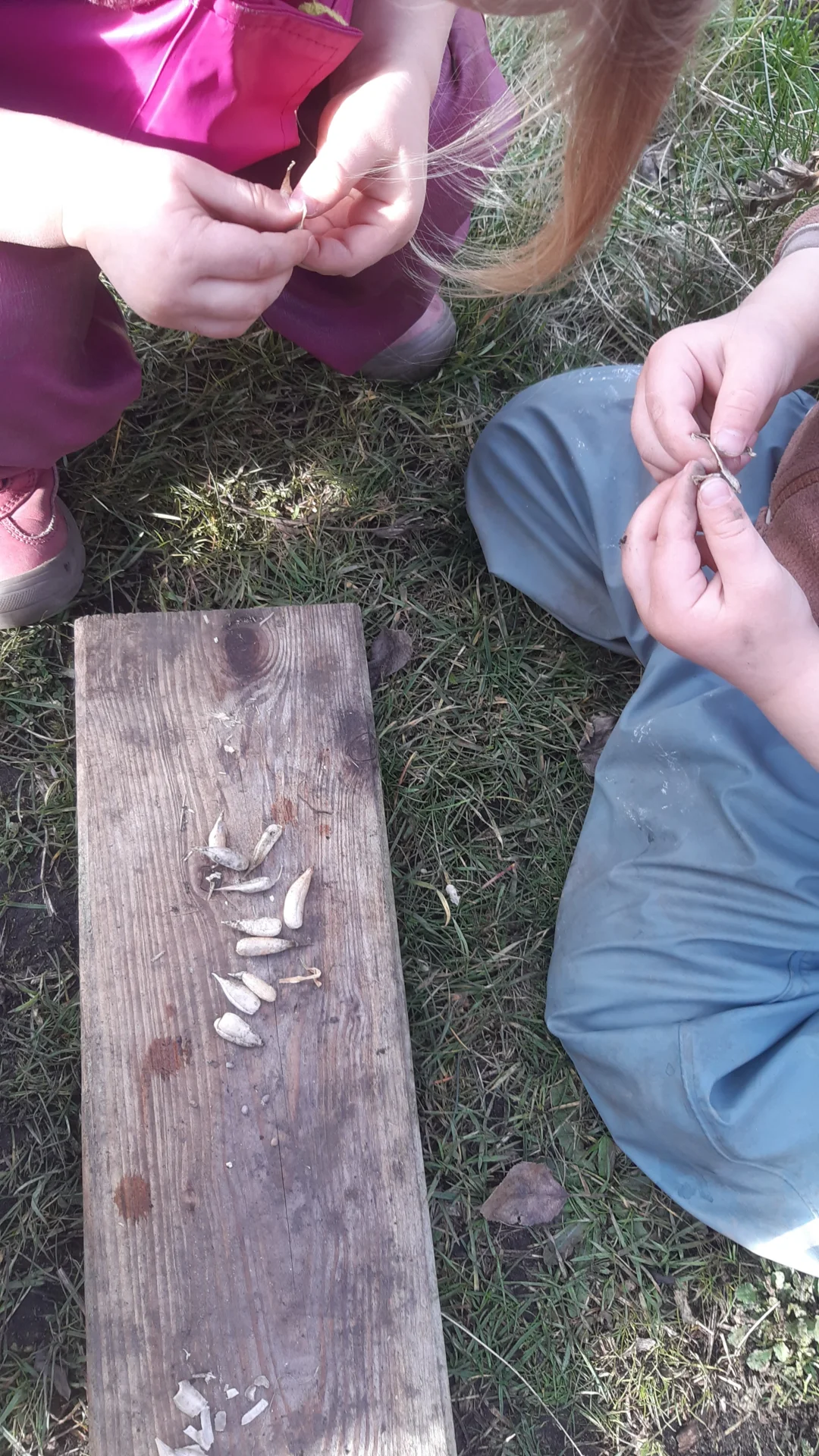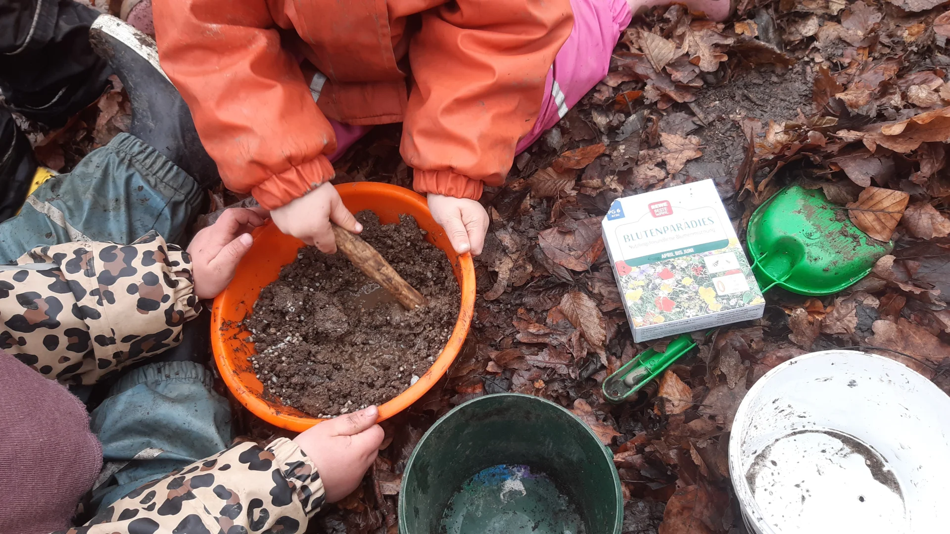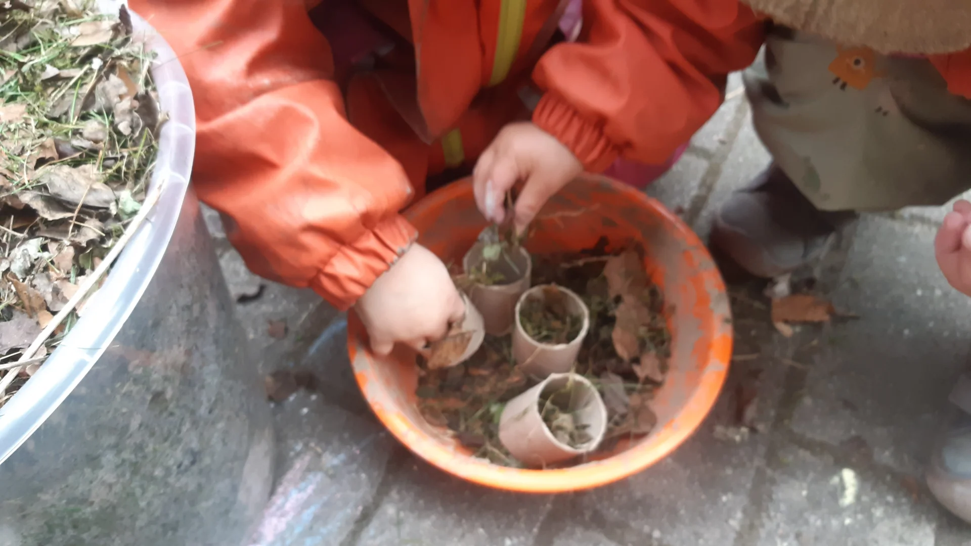 Sie schulen ihre Feinmotorik, indem sie Naturmaterialien aufsammeln, mit Stöcken, Steinen, Blättern spielen, mit Kreide malen, mit ihren Händen “Matschsuppe” herstellen, in unserem Garten Beeren pflücken, Samen oder Kartoffeln in die Erde stecken, Laub aufsammeln usw.